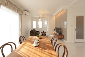 空間全体が統一感に包まれ、家族が自然と集まりたくなる心地よさがあります。