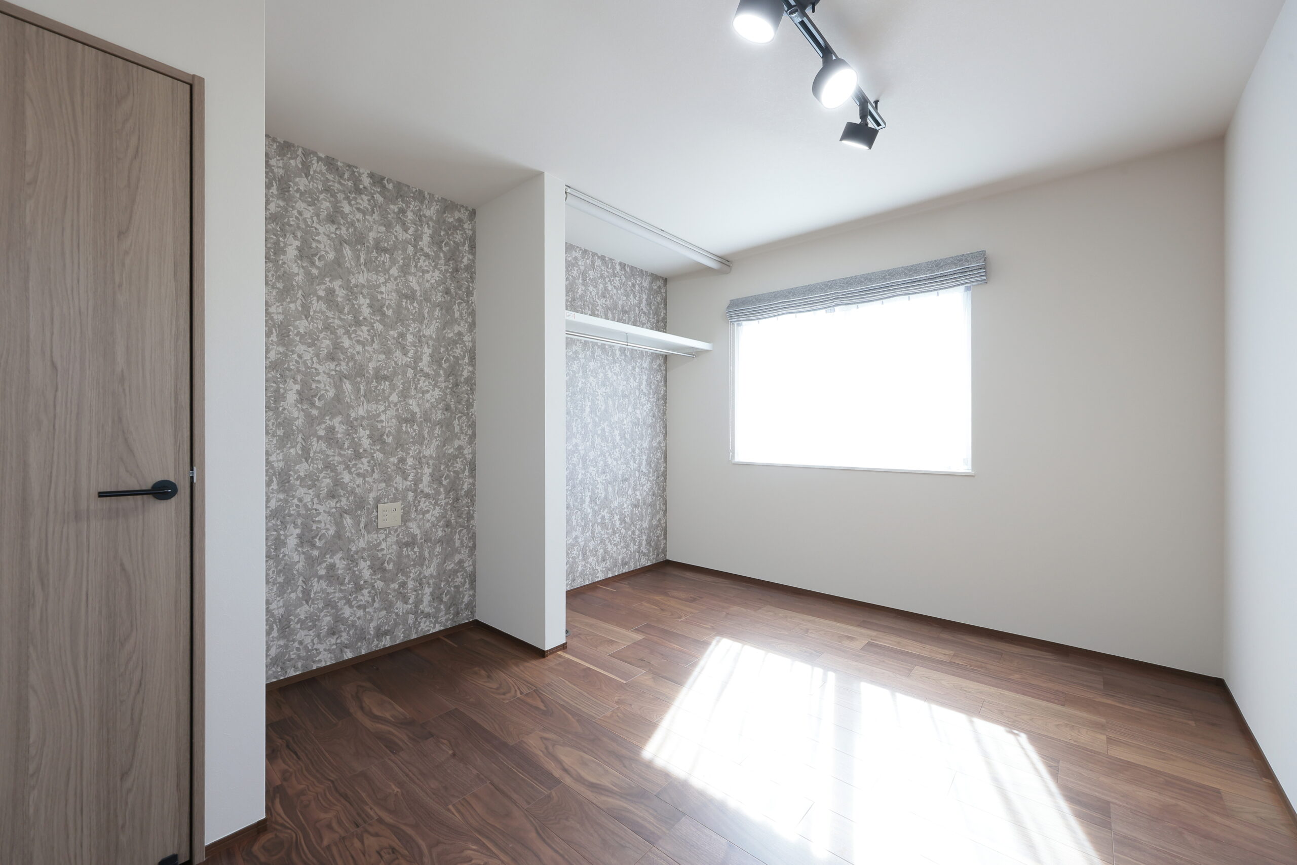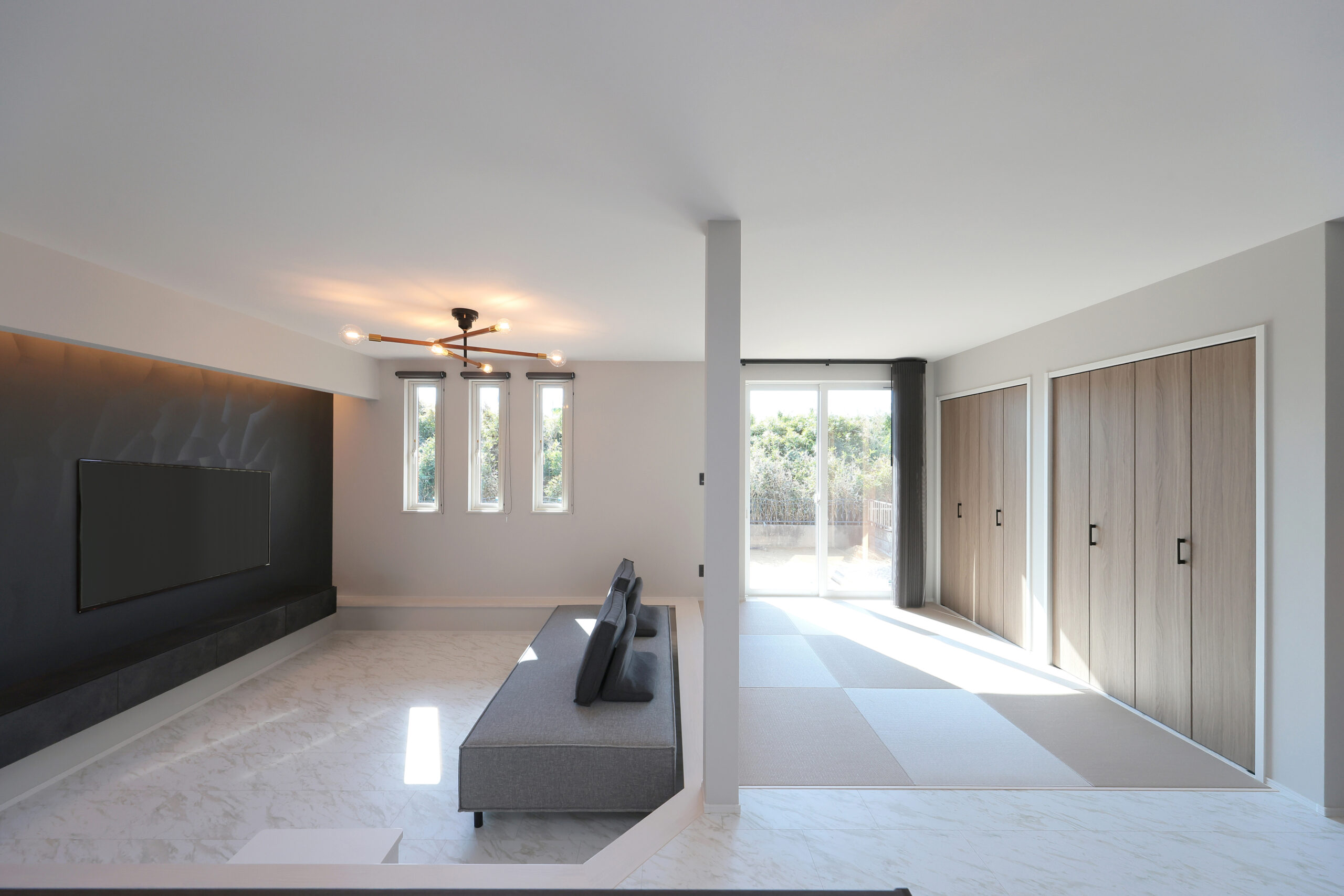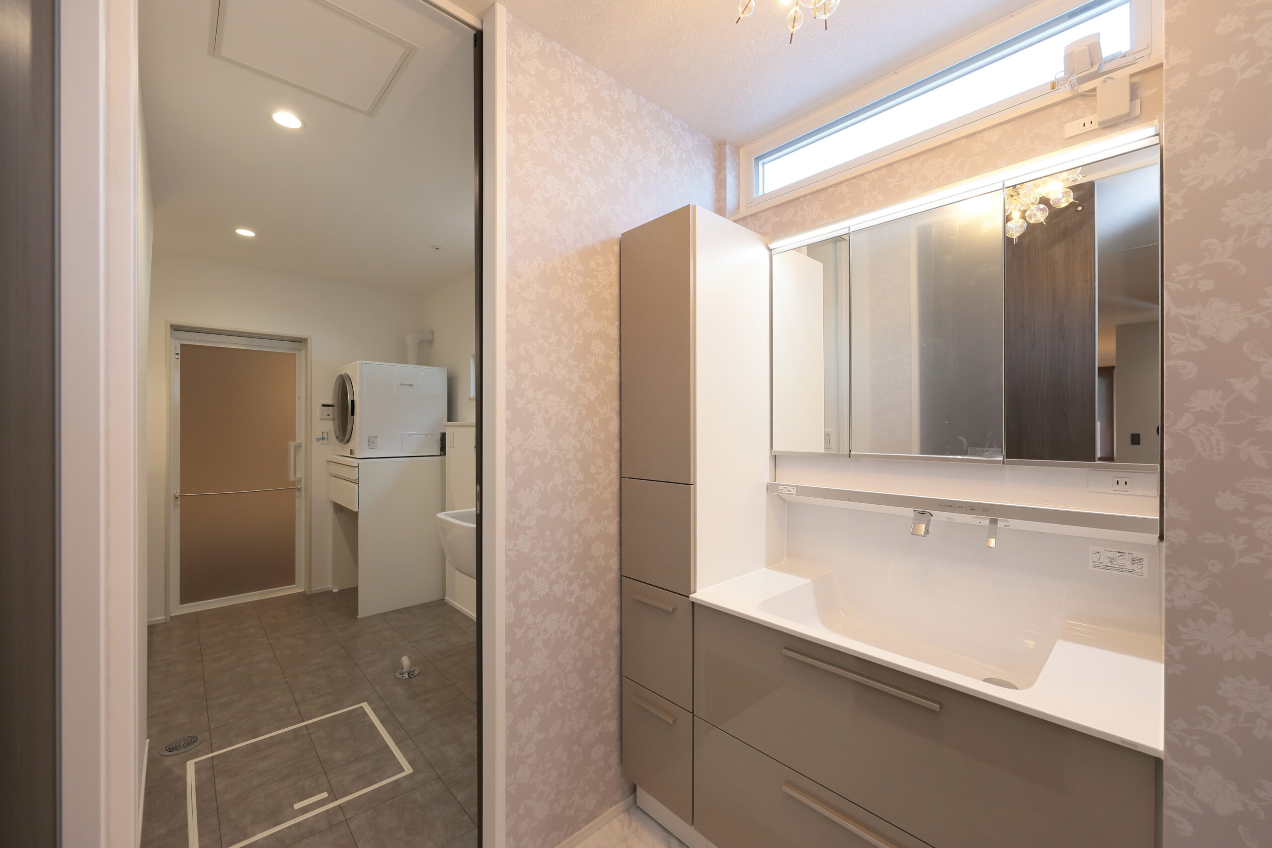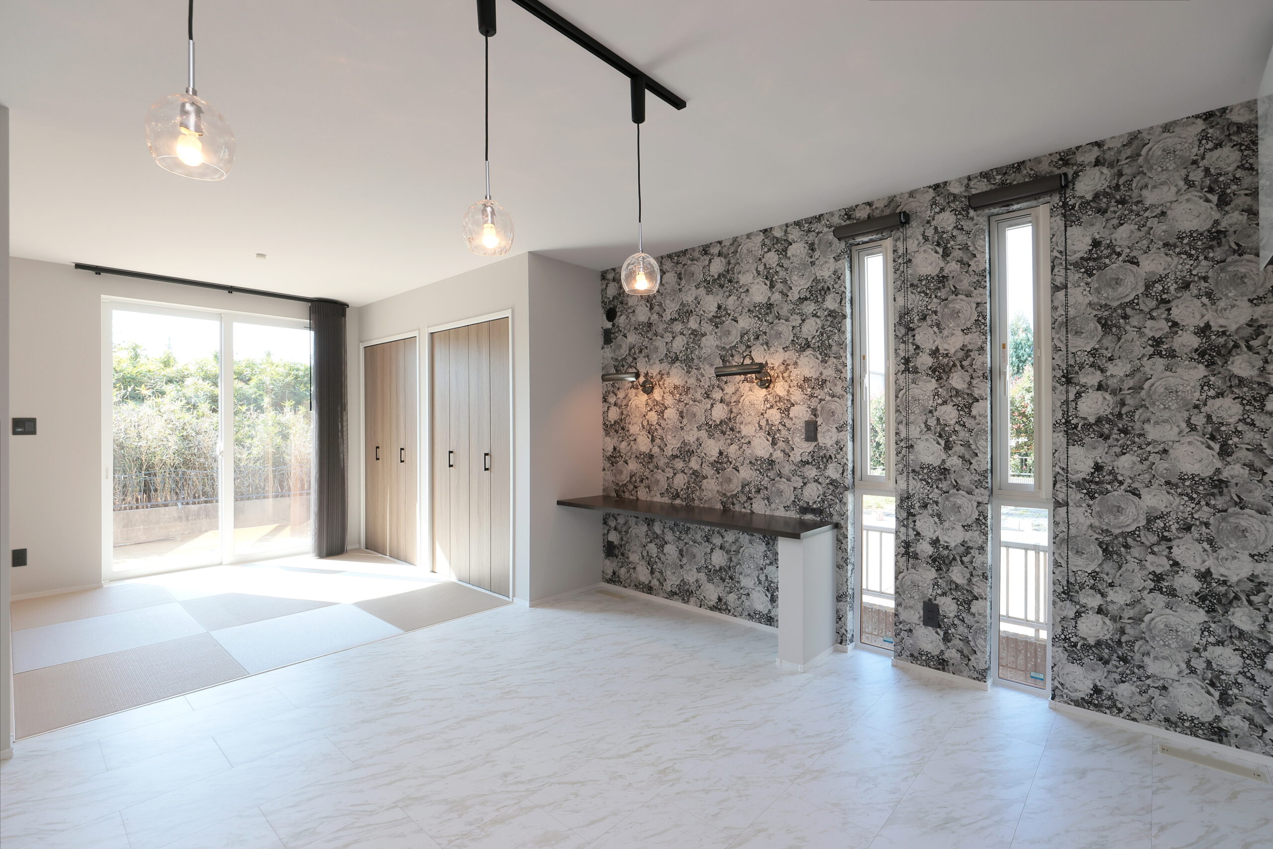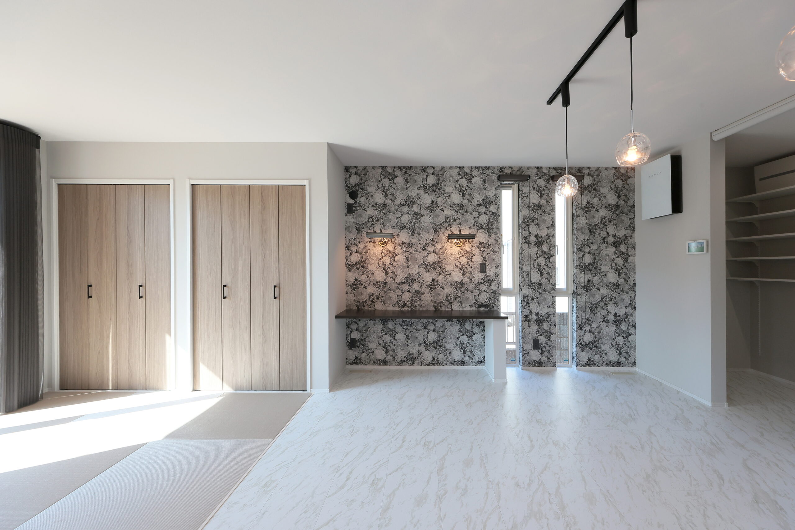 照明やクロスの使い方がとても上手な施工事例です。ペンダントライトや間接照明が空間に立体感を与え、モノトーンの花柄アクセントクロスが上質な雰囲気を演出。リビングには家族がくつろげる畳コーナーを設け、隣接するランドリー室の横には使い勝手の良いファミリークローゼットを配置。さらに小屋裏収納もあり、見た目と機能性を両立した快適な住まいです。