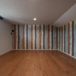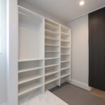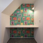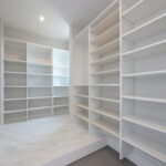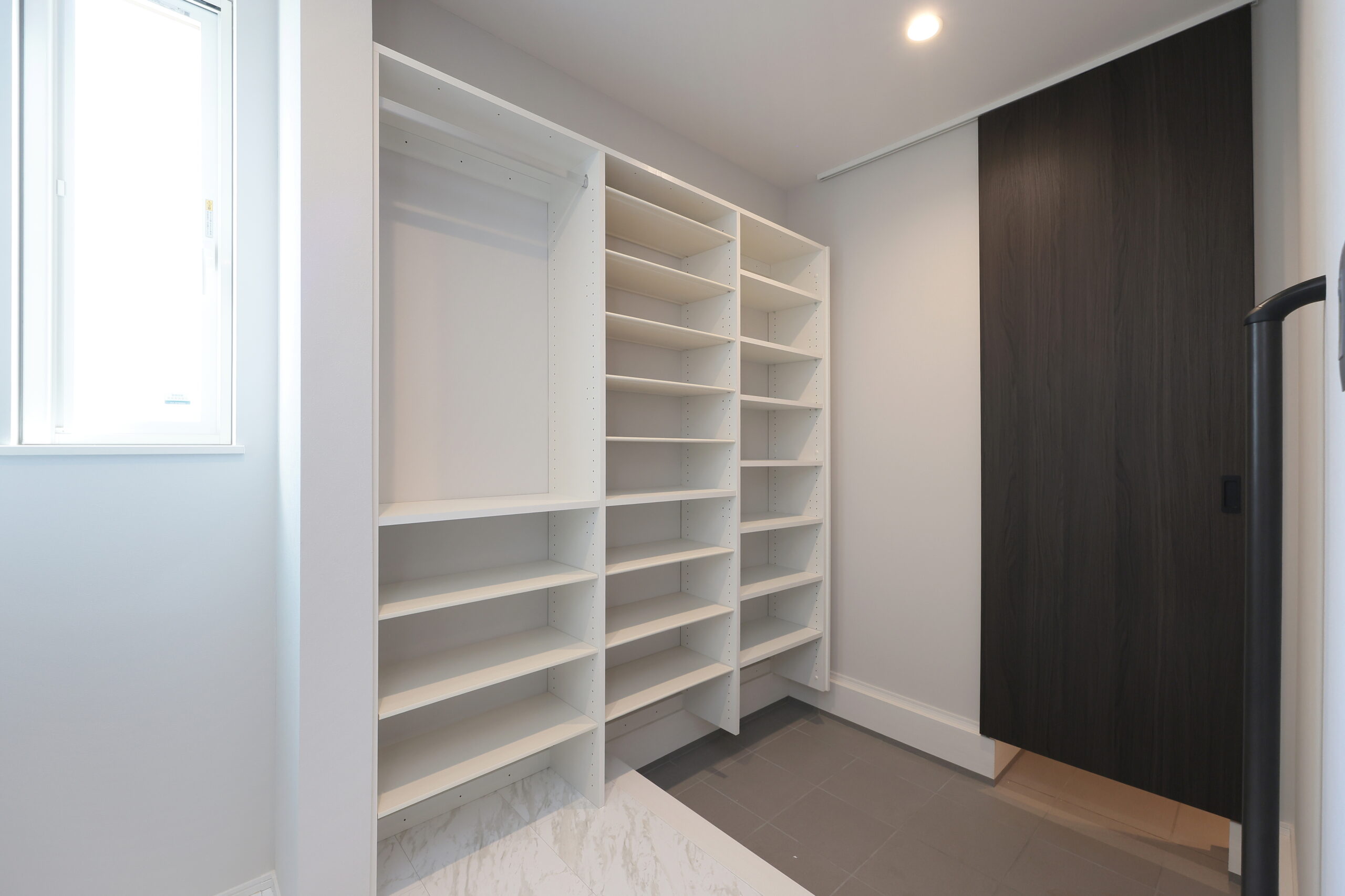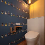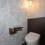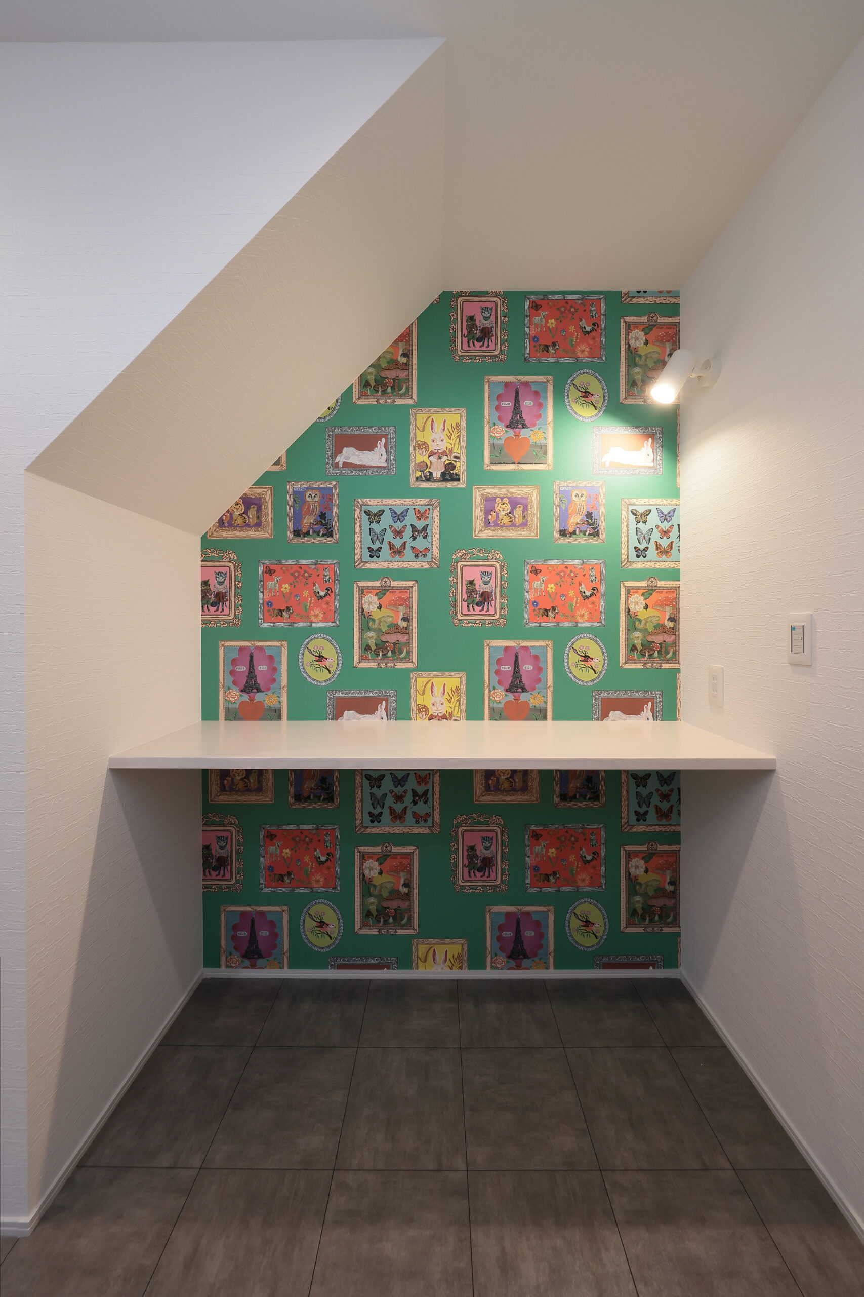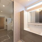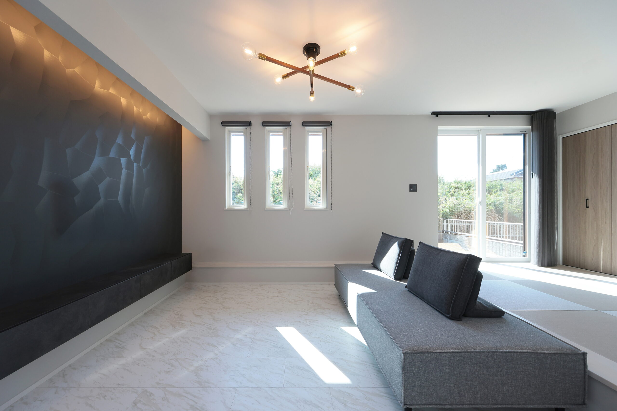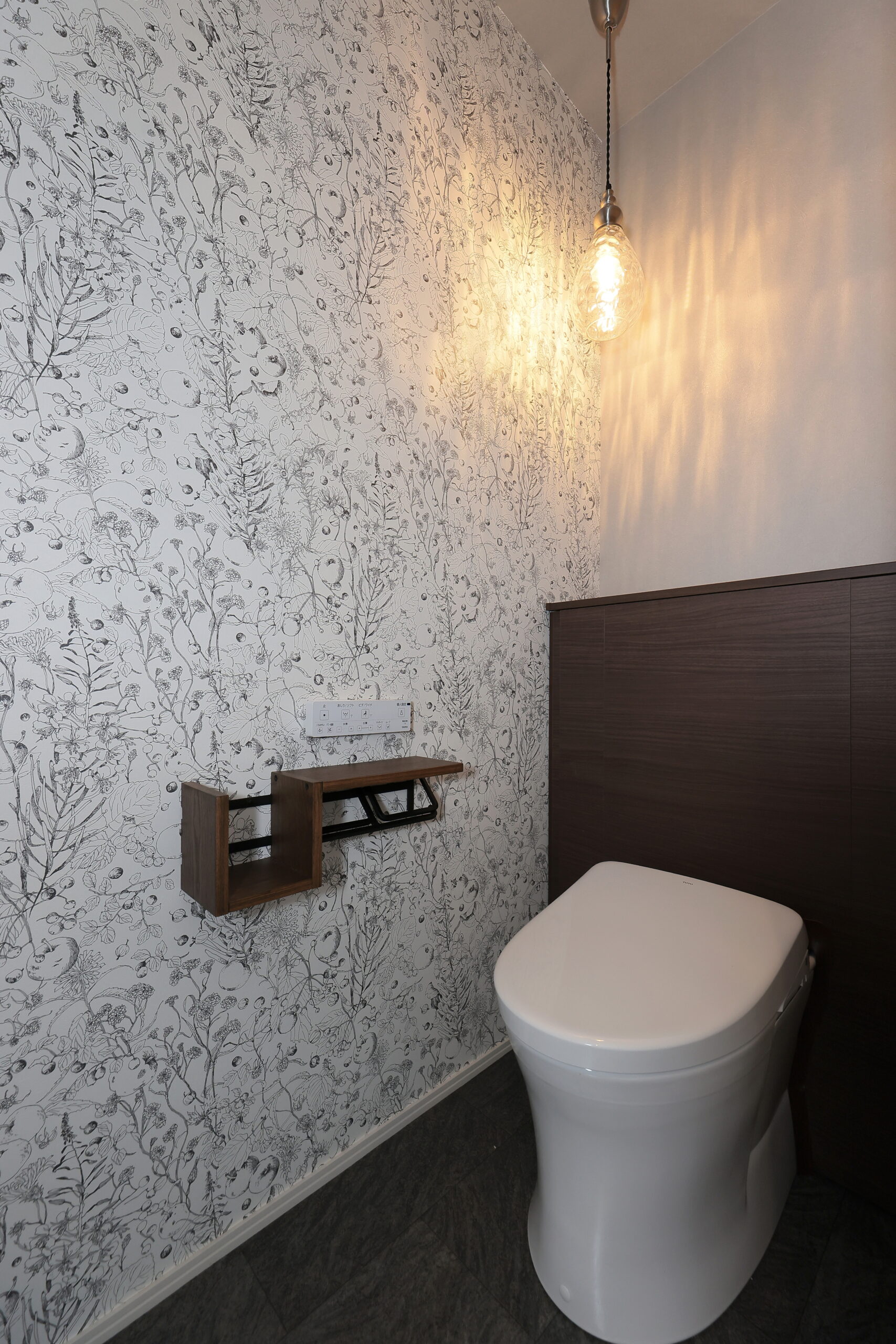 照明やクロスの使い方がとても上手な施工事例です。ペンダントライトや間接照明が空間に立体感を与え、モノトーンの花柄アクセントクロスが上質な雰囲気を演出。リビングには家族がくつろげる畳コーナーを設け、隣接するランドリー室の横には使い勝手の良いファミリークローゼットを配置。さらに小屋裏収納もあり、見た目と機能性を両立した快適な住まいです。