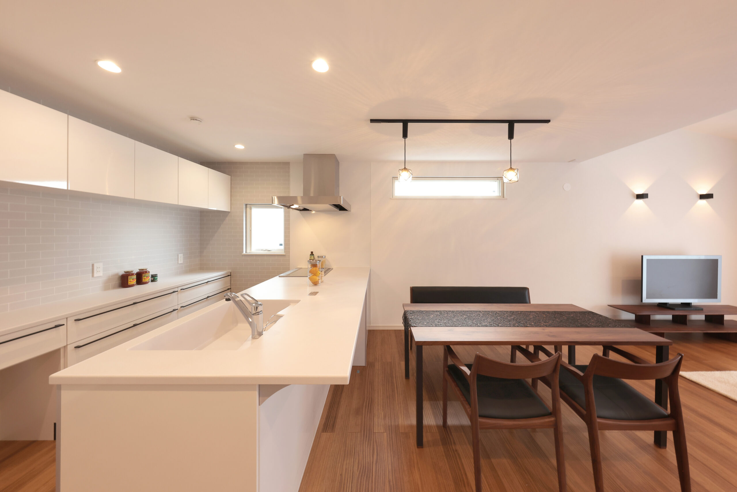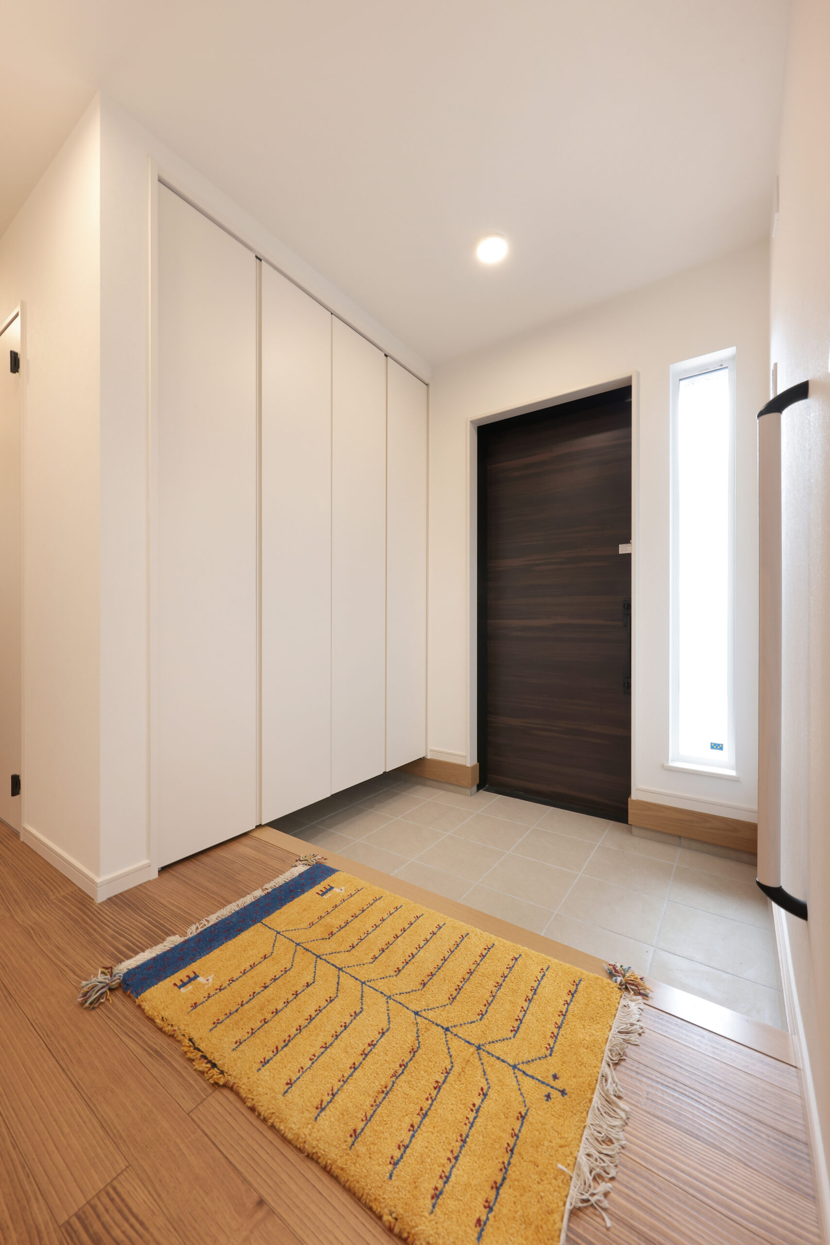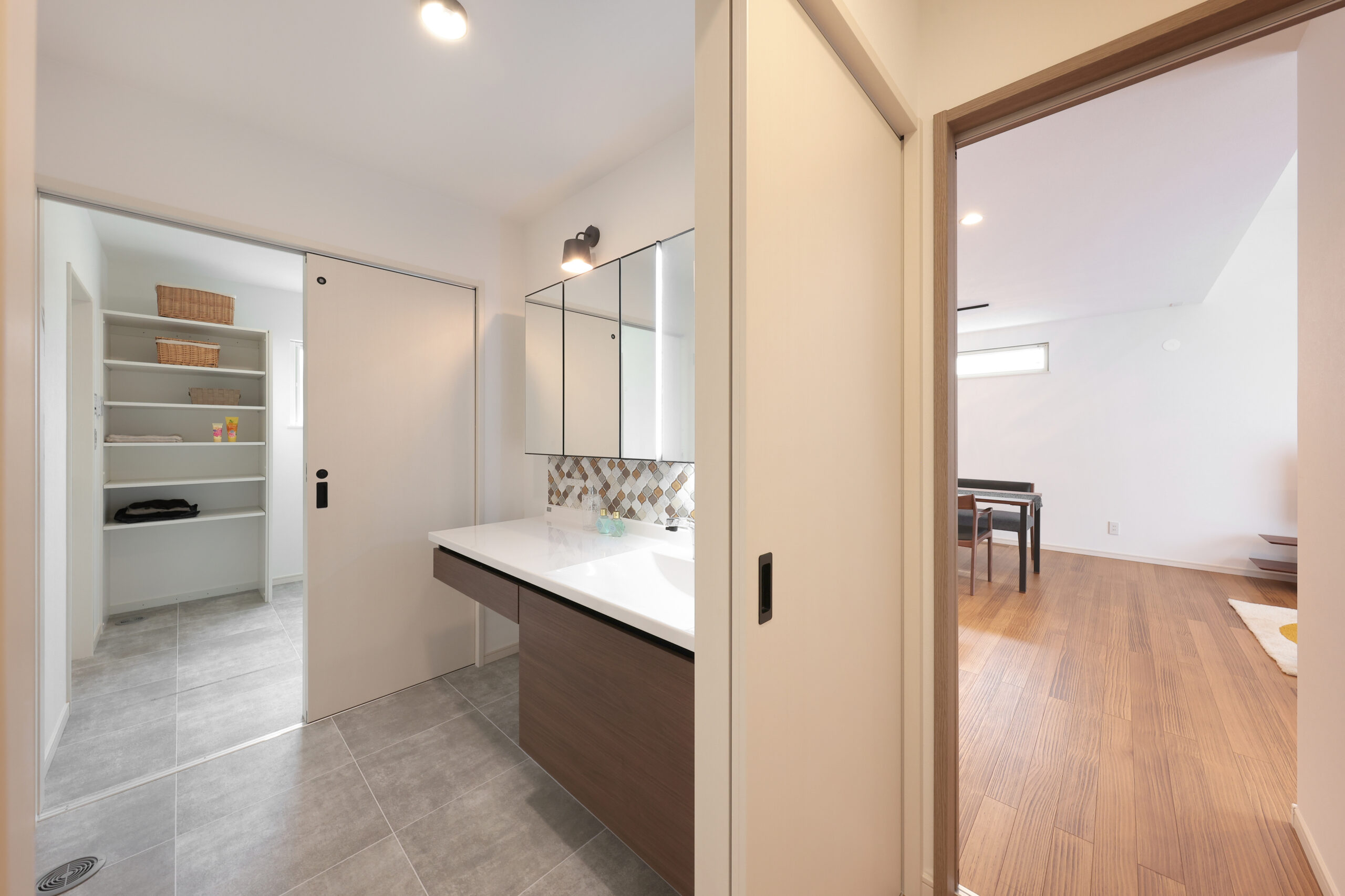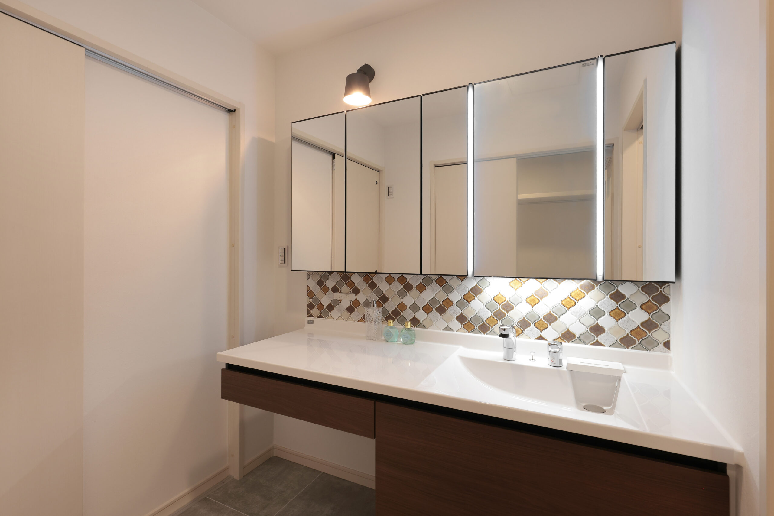 黒い外観がシックな印象を与える住まいで、玄関周りはブラウンで貼り分け、温かみをプラス。フルフラットキッチンが開放的な空間を作り、小上がりの和室がリラックスしたひとときを提供します。洗面にはモロッカンタイルがアクセントとなり、間接照明が柔らかな光で空間を演出。勾配天井が広がりを感じさせ、デザイン性と機能性が調和した住まいです。