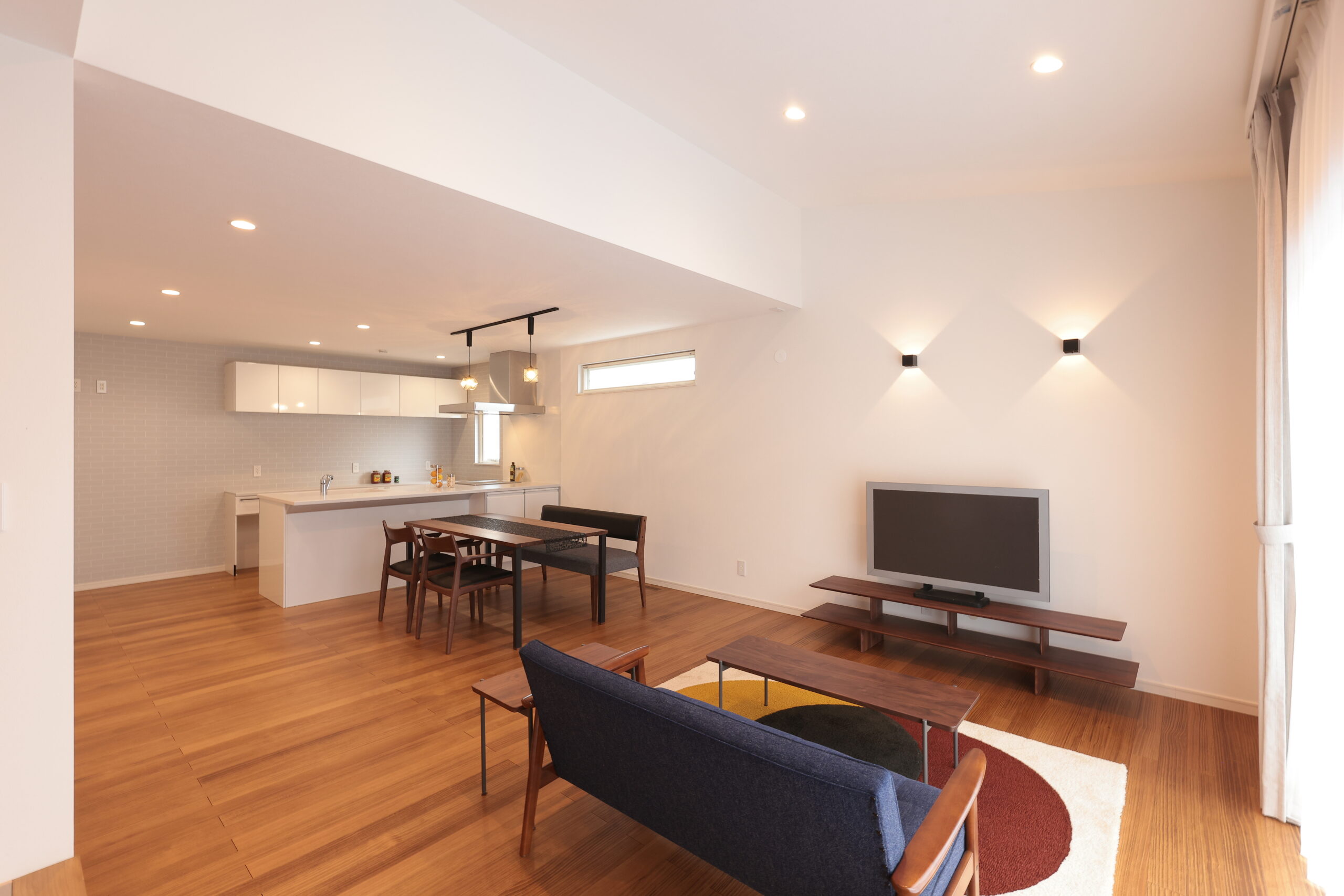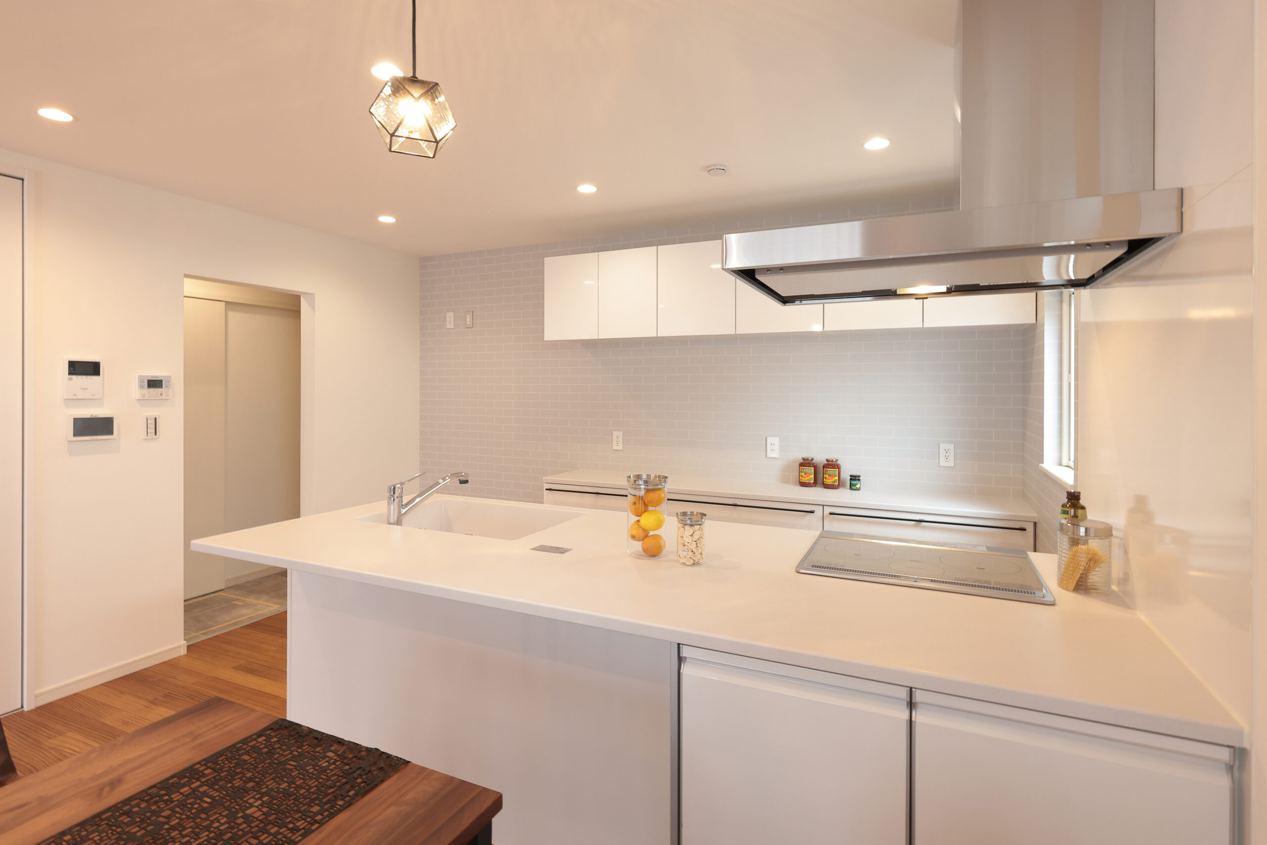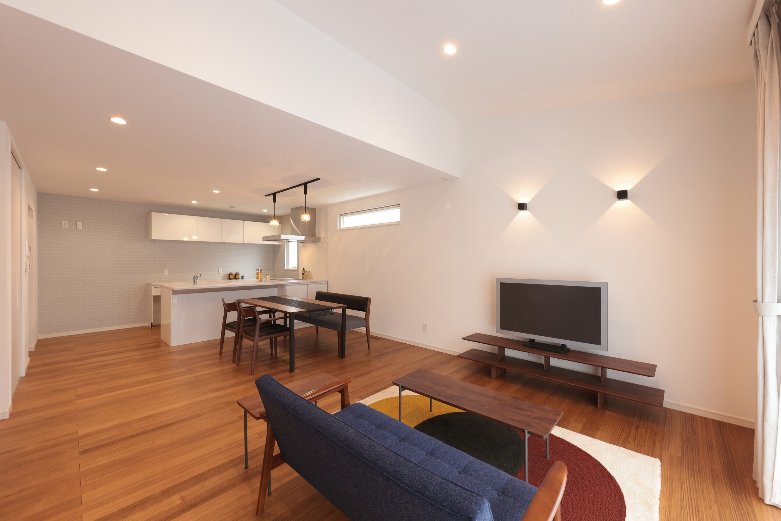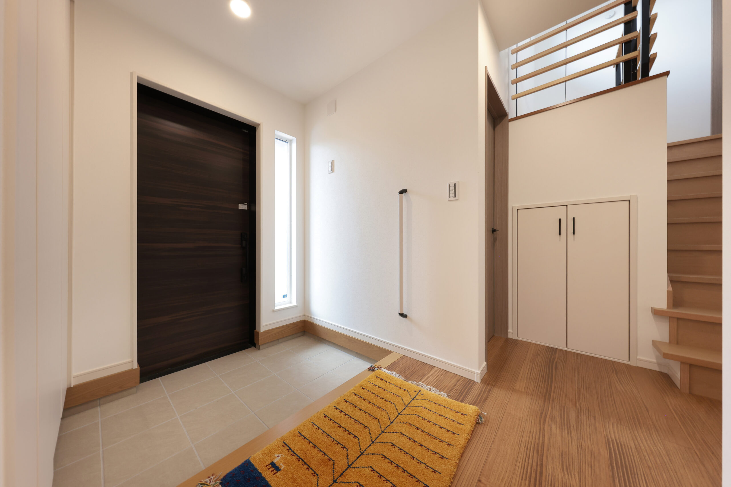 黒い外観がシックな印象を与える住まいで、玄関周りはブラウンで貼り分け、温かみをプラス。フルフラットキッチンが開放的な空間を作り、小上がりの和室がリラックスしたひとときを提供します。洗面にはモロッカンタイルがアクセントとなり、間接照明が柔らかな光で空間を演出。勾配天井が広がりを感じさせ、デザイン性と機能性が調和した住まいです。
