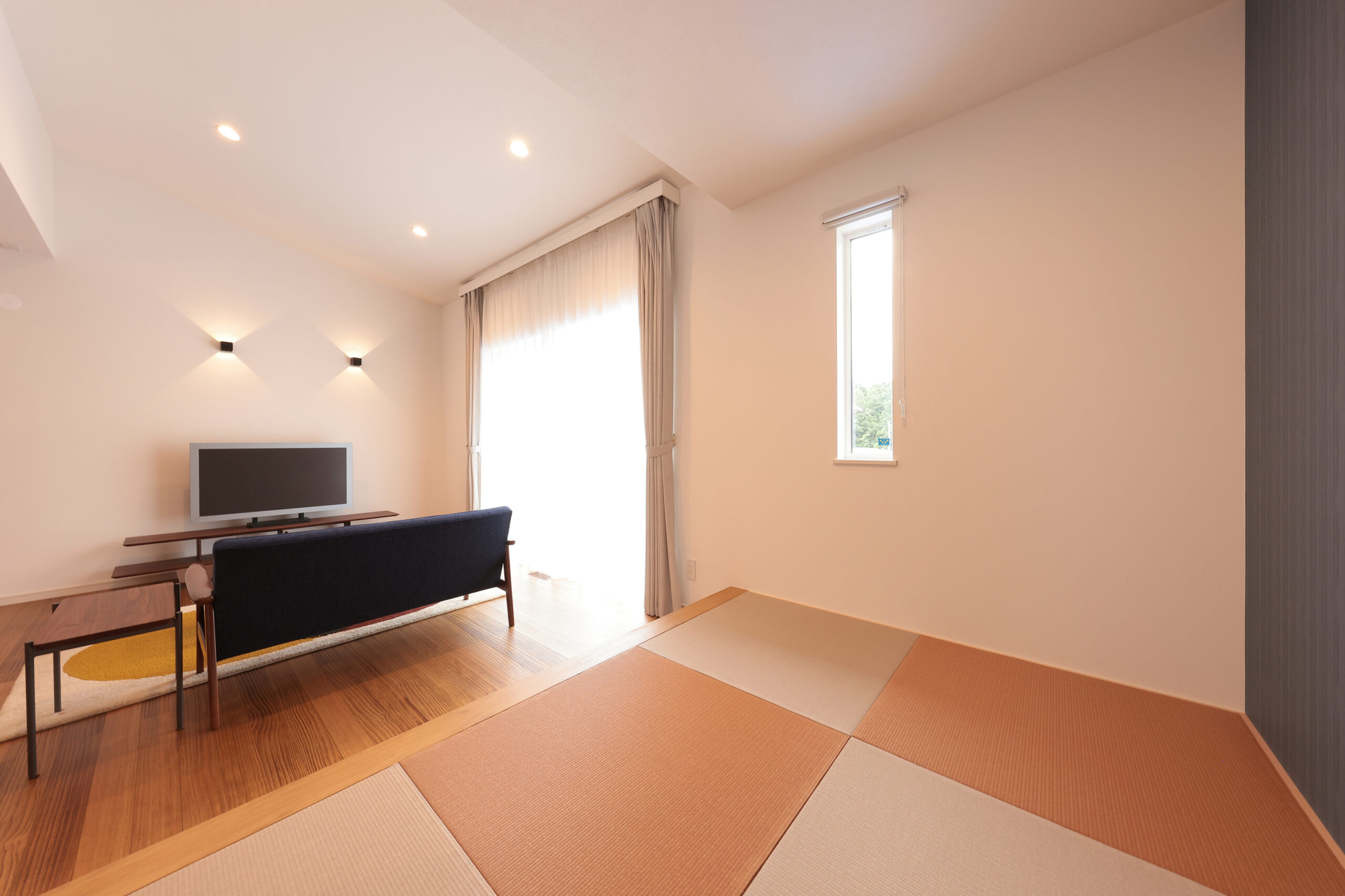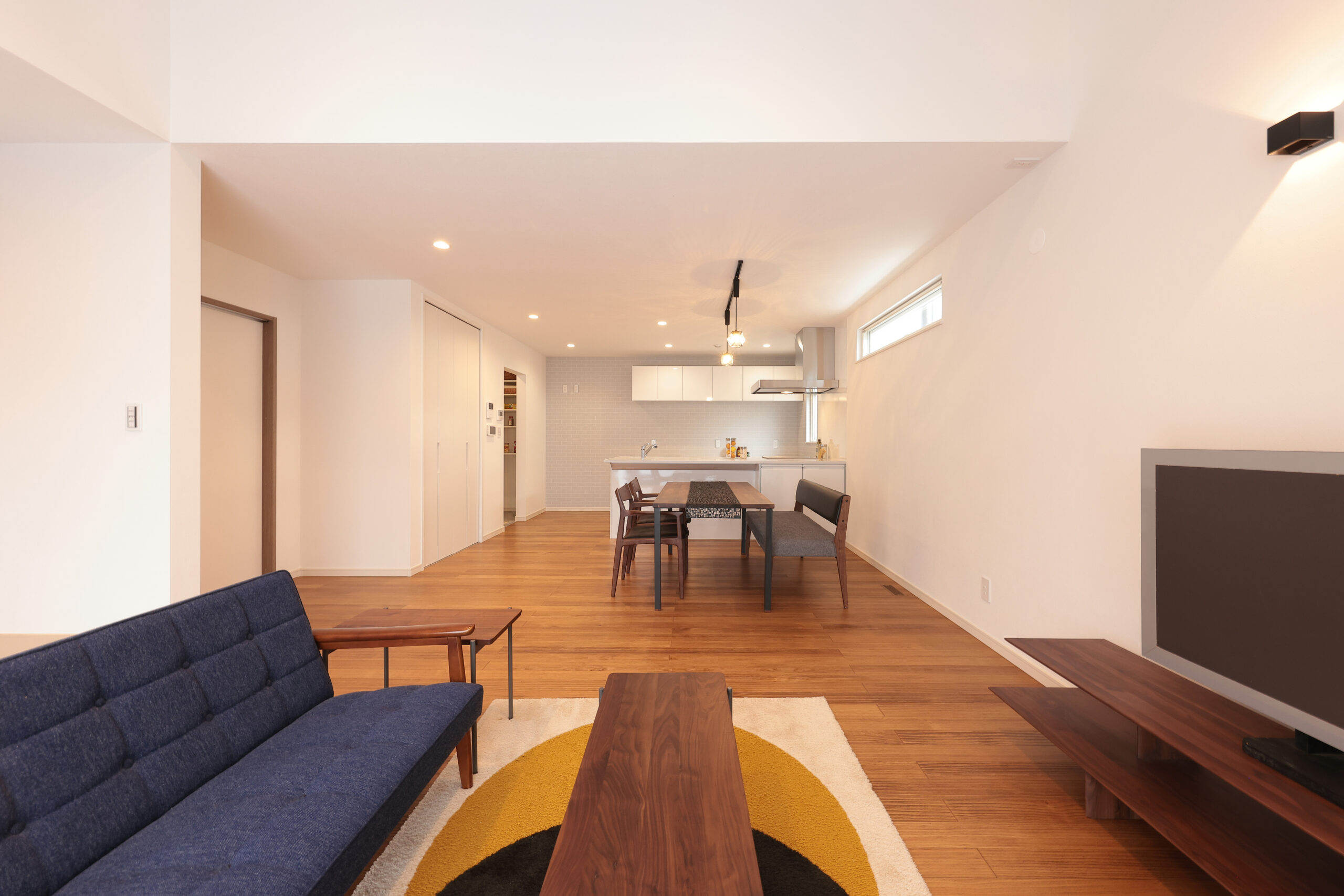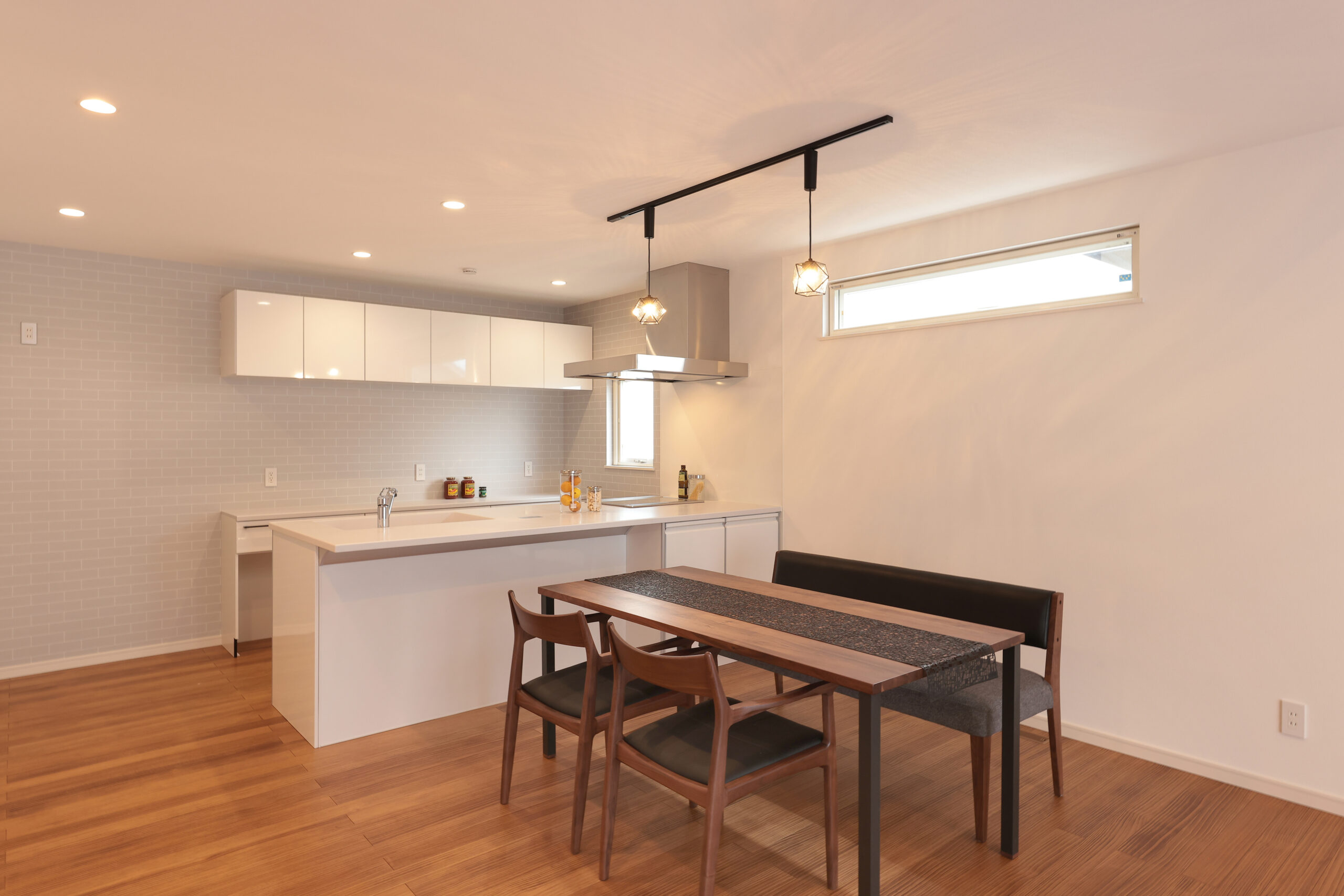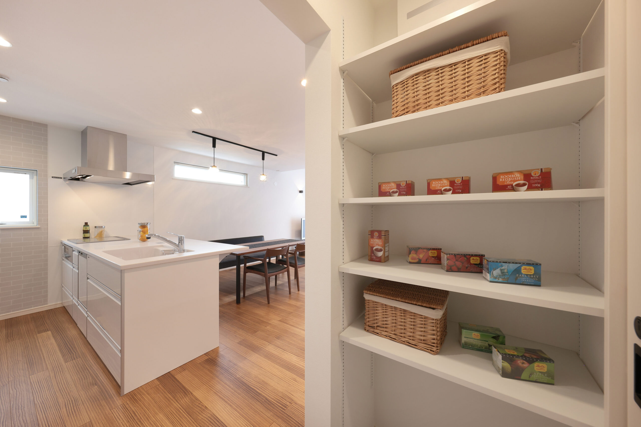 黒い外観がシックな印象を与える住まいで、玄関周りはブラウンで貼り分け、温かみをプラス。フルフラットキッチンが開放的な空間を作り、小上がりの和室がリラックスしたひとときを提供します。洗面にはモロッカンタイルがアクセントとなり、間接照明が柔らかな光で空間を演出。勾配天井が広がりを感じさせ、デザイン性と機能性が調和した住まいです。