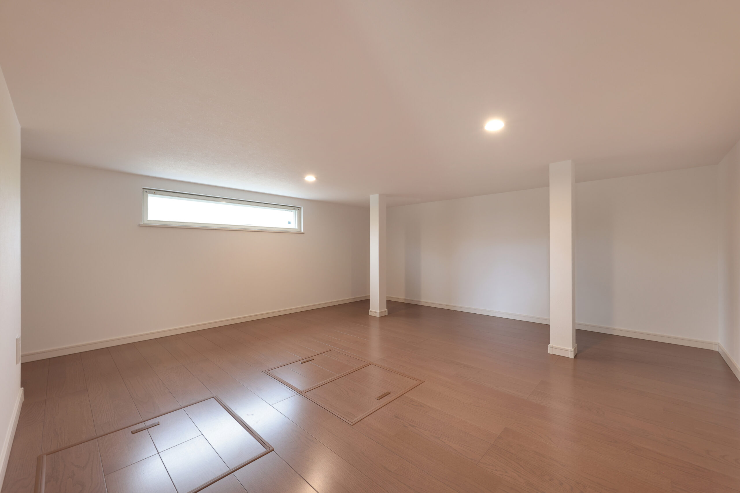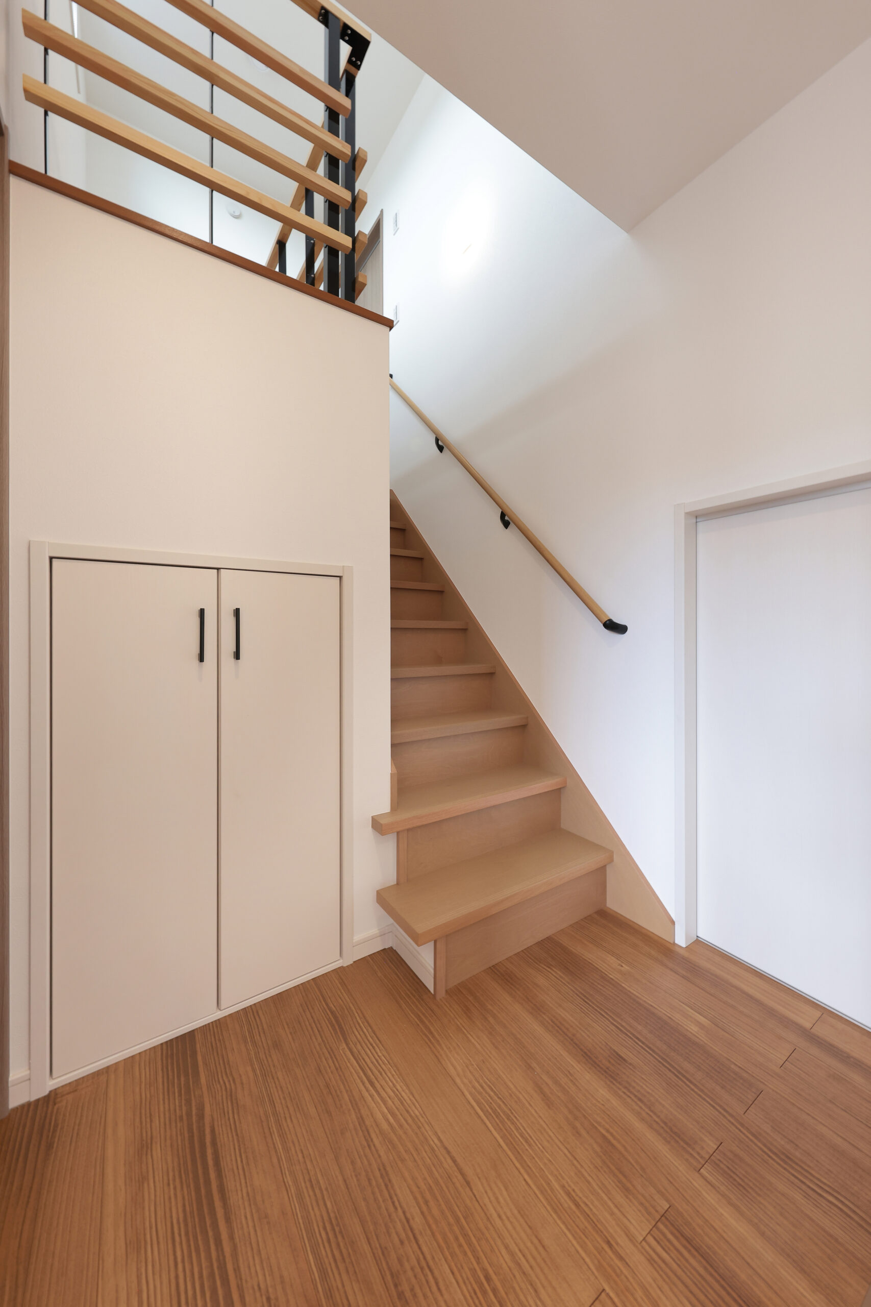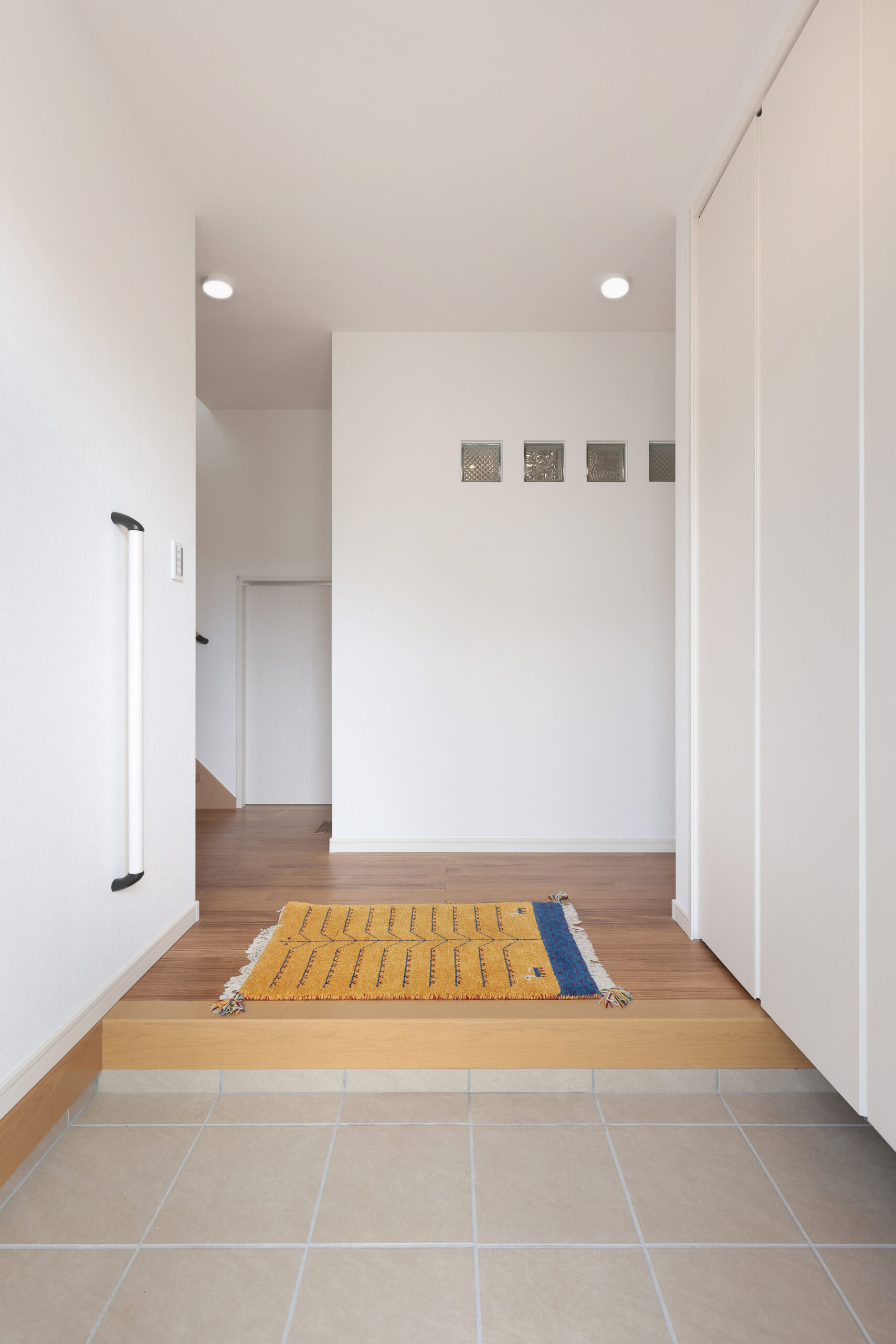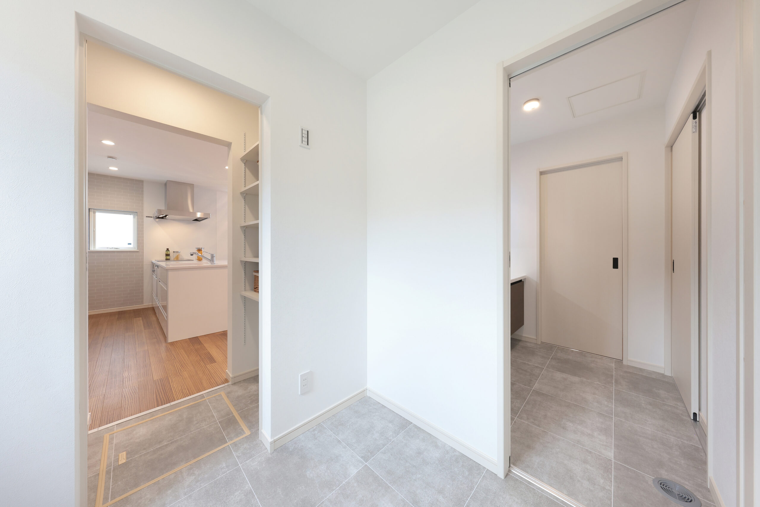 黒い外観がシックな印象を与える住まいで、玄関周りはブラウンで貼り分け、温かみをプラス。フルフラットキッチンが開放的な空間を作り、小上がりの和室がリラックスしたひとときを提供します。洗面にはモロッカンタイルがアクセントとなり、間接照明が柔らかな光で空間を演出。勾配天井が広がりを感じさせ、デザイン性と機能性が調和した住まいです。