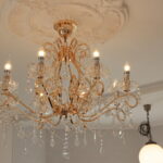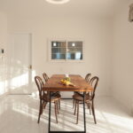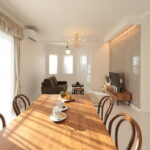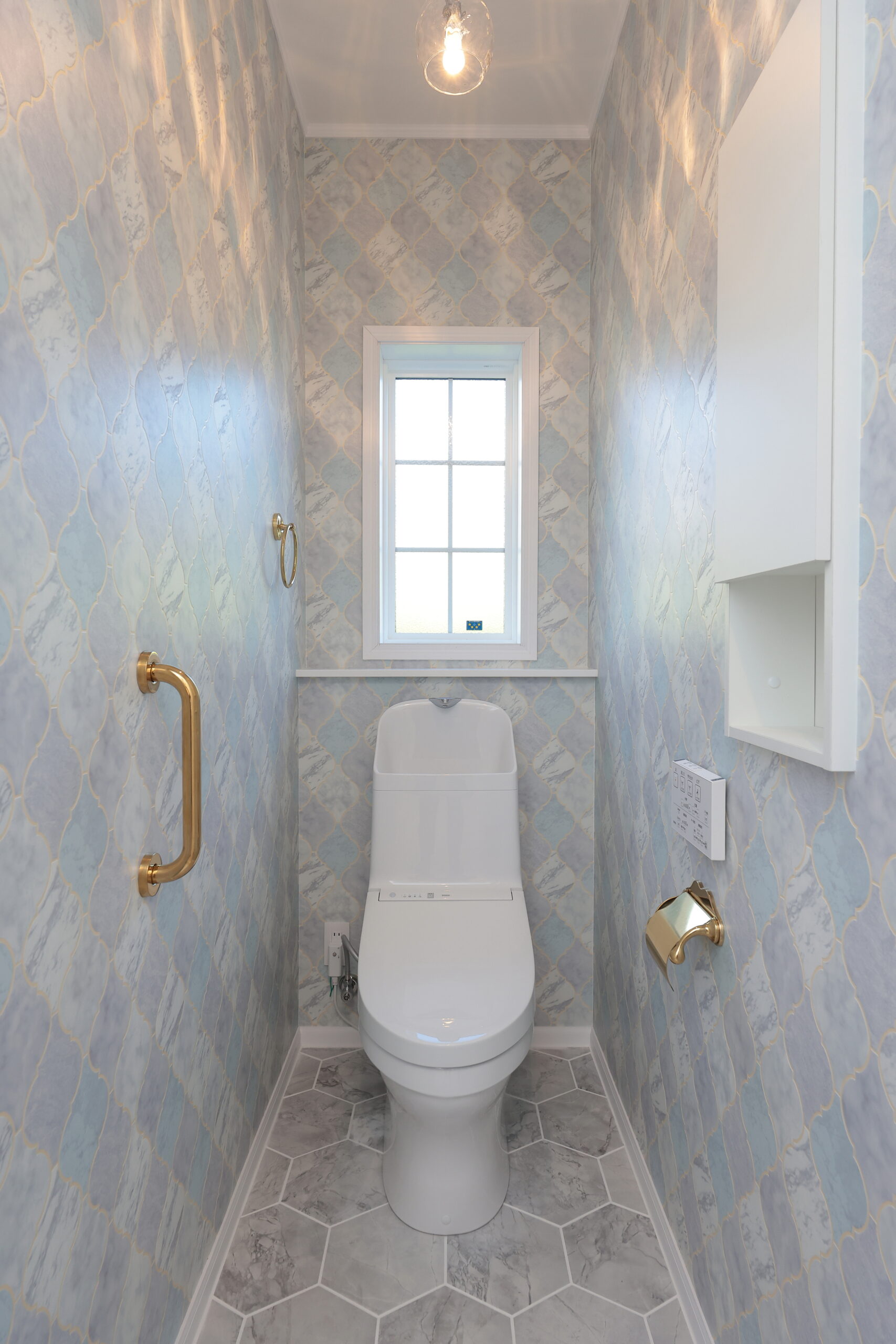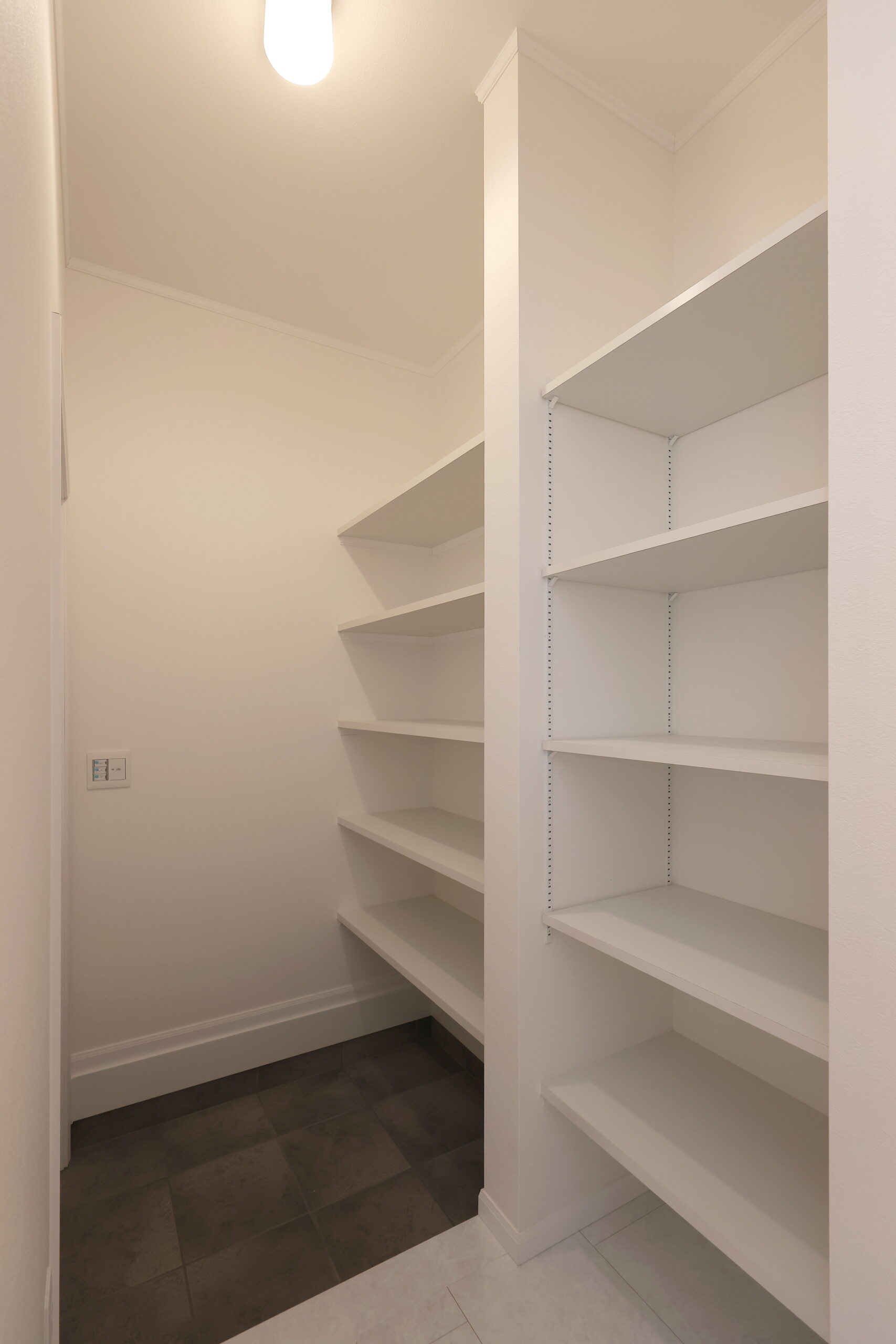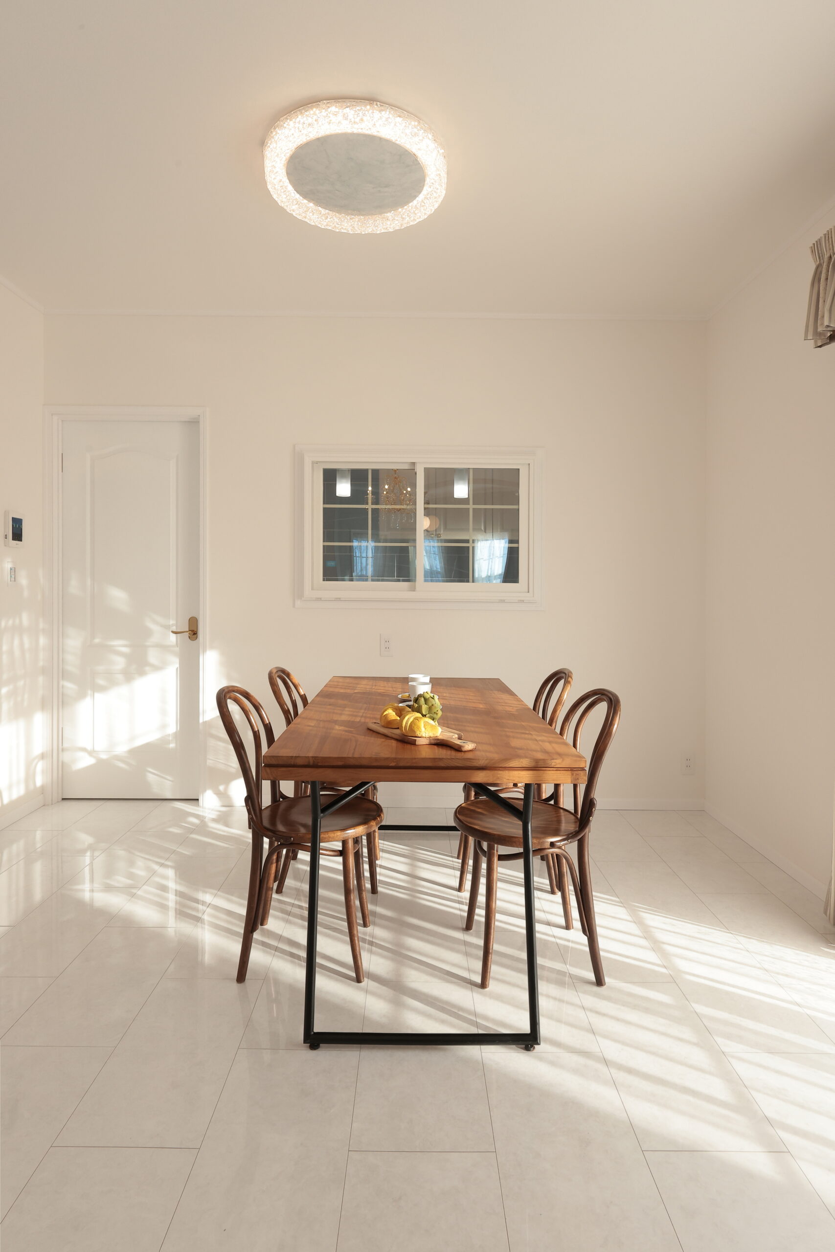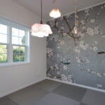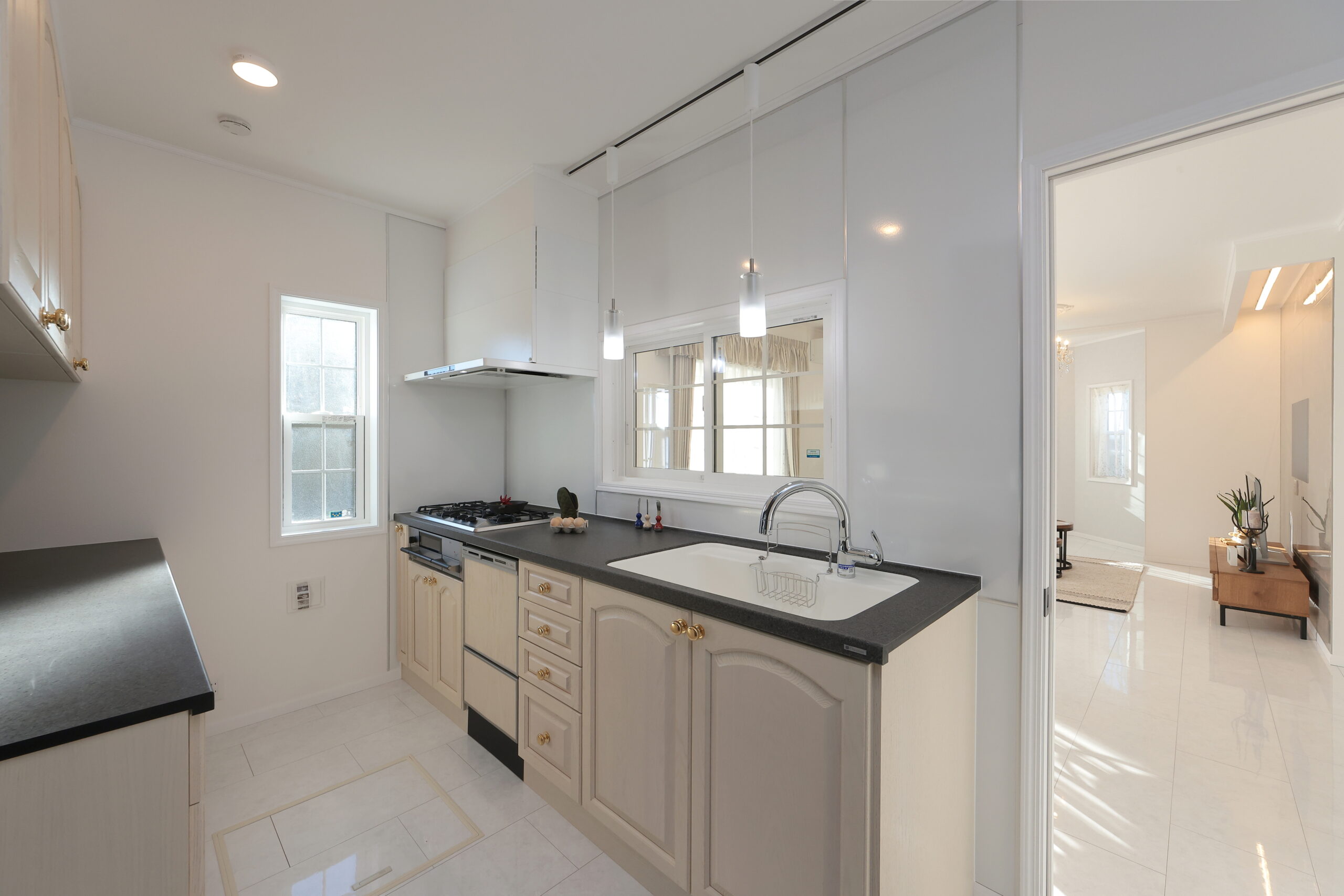 外観はクラシカルでありながら、平屋ならではの落ち着きと品格を感じさせます。室内にはシャンデリアのやさしい輝きと、天井のメダリオンが白を基調とした空間に上品な華やかさをプラス。床にはハピアフロアを採用し、明るく清潔感のある心地よい住まいに仕上げました。アクセントとなる塔屋や、モダンな和室も備え、洋と和が美しく調和する一邸です。