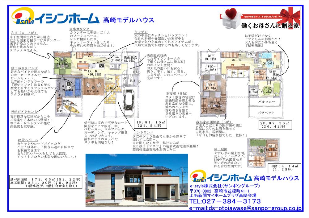 Human/Happy life(幸せな人生から逆算して家を創る)の【H】、Ecology/Eco-price/Eco-life(省エネと経済性の両面から、住宅ローンの支払い計画までを設計)の【E】、Idea/Ideal(理想と夢をさまざまなプロのアイデアで解決)の【I】、そして、Good design(押しつけのカッコイイだけのものではなく、 主婦の意見を取り入れ、医学、教育までを含めた総合的な設計)の【G】それぞれのコンセプトの頭文字をとったものです。カーテン照明、食器棚などオプションになる場合が多いですが、イシンホームは全てが盛り込まれた充実の標準仕様でお財布と家計に優しい家をご提案いたします。また構造材には世界最古の木造建築物である「法隆寺」にも使われ、高級素材と言われている「国産桧の集成材」を使い、大きな地震の揺れを軽減する減振装置も標準で付き、強度も保ち、お客様の安全と財産と想い出をお守りします・・・。