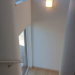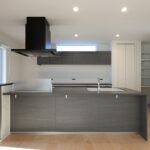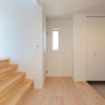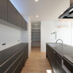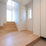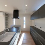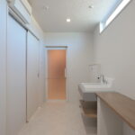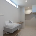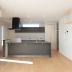 明るい光が差し込むLDKに、存在感のあるフルフラットキッチンを採用。リビングとの一体感が生まれ、家族と会話を楽しみながら料理ができる開放的な空間です。キッチン背面にはしっかり収納を確保し、見た目もすっきりとしたデザインに。玄関正面にはFIX窓を設け、外の光を取り込みながら開放感のある迎え入れの空間を演出しました。さらにランドリー室には作業カウンターとクローゼットを設置し、洗う・干す・たたむ・しまうまでを一か所で完結。毎日の家事がスムーズに進む、暮らしやすさにこだわった住まいです。