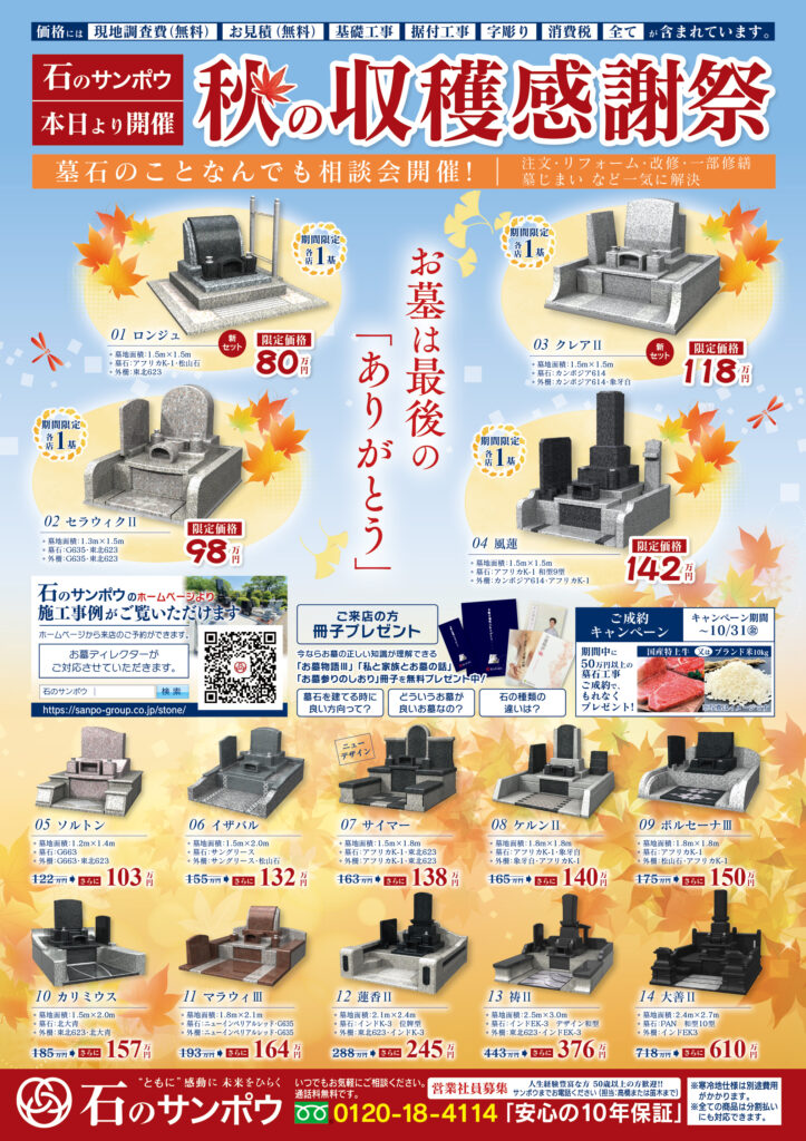 石のサンポウでは、秋の収穫感謝祭としまして、墓石の限定価格販売をいたします。