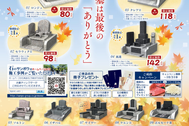 石のサンポウでは、秋の収穫感謝祭としまして、墓石の限定価格販売をいたします。また、お墓の新規建立からリフォーム、ご相談まで、この機会にぜひご利用ください。 伝統的な和型や位牌型、モ …