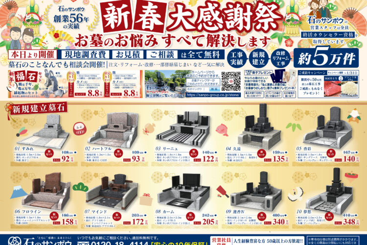 本年も石のサンポウをご愛顧いただき、誠にありがとうございます。来る年も、ご先祖様を想う皆さまのお気持ちに寄り添えるよう、より一層サービスの向上に努めてまいります。 【年末年始 営業 …
